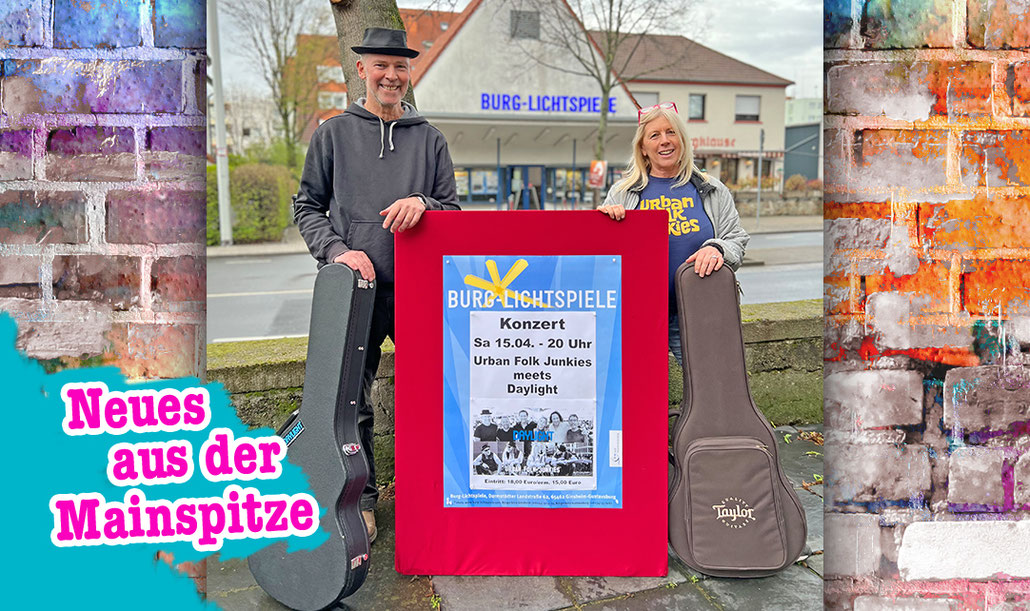 „Für Musiker ist es das Größte, wenn Leute Konzerte besuchen, um eigene Titel der Künstler – und keine Cover-Songs – zu hören“, sind sich Barbara Wiebe und Wolfgang Dürr einig. Unabhängig von einander, aber fast zeitgleich gründeten sie aus diesem Grund die Bandformationen »Urban Folk Junkies« und »Daylight«. Am Samstag, den 15.04. präsentieren die beiden Bands mit Ursprung in Ginsheim-Gustavsburg ein Doppelkonzert in den Burg-Lichtspielen.