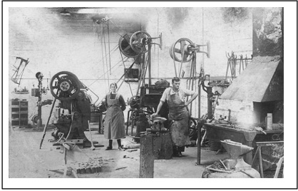 Schon 1928 kann der junge Unternehmer sich an der Erneuerung der Straßenbeleuchtung (1) in Ginsheim einbringen. Seine Schmiede in der Rheinstraße 45 ist modern aufgestellt und leistungsfähig. Das Bild (2) aus dem Jahr 1926 zeigt ihn mit seiner Frau Katharina, geb. Reinheimer. Er ist gefragt für seine Eisenwaren und Schlosserarbeiten. Nach dem Zeiten Weltkrieg wirbt er mit Geschenkartikeln für alle Gelegenheiten, Haushaltswaren, Haus- und Küchengeräten. Auch Badewanne, Toilettenschüsseln und Heißwasserboiler sind in seinem Angebot. Später kommen Öfen, Herde, Gartengeräte und WMF-Erzeugnisse hinzu. Auch erhält er die Erlaubnis, im Hausartikelgeschäft Feuerwerkskörper zu verkaufen (3).