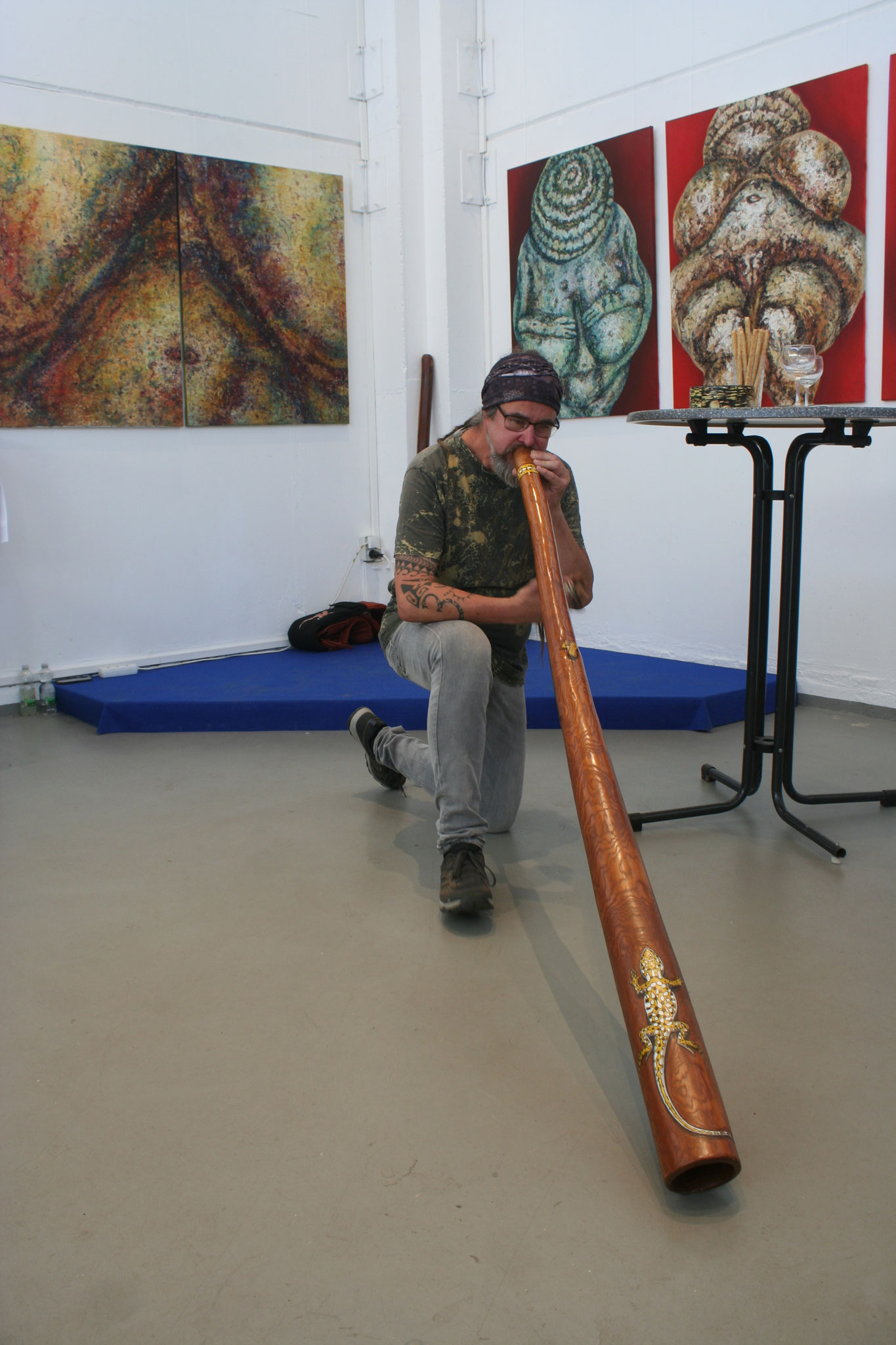 Für die musikalische Untermalung sorgte Kay Freier aus Budenheim mit Klängen aus dem Didgeridoo – einem traditionellen Instrument der Aborigines. Seine erdigen, mystischen Töne bildeten eine klangliche Brücke zum Thema der Ausstellung.